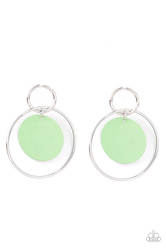 A minty Green Ash disc swings from two interlocking silver hoops, creating a flirtatious pop of color. Earring attaches to a standard post fitting.