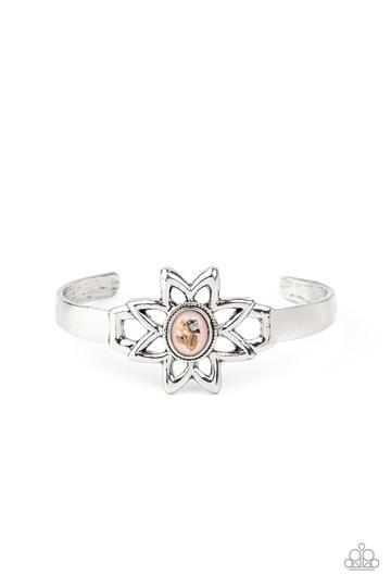 Flecked in shell-like shimmer, a glassy pink stone bead is pressed into the center of a shiny silver daisy frame that sits atop a dainty silver cuff for a seasonal flair.